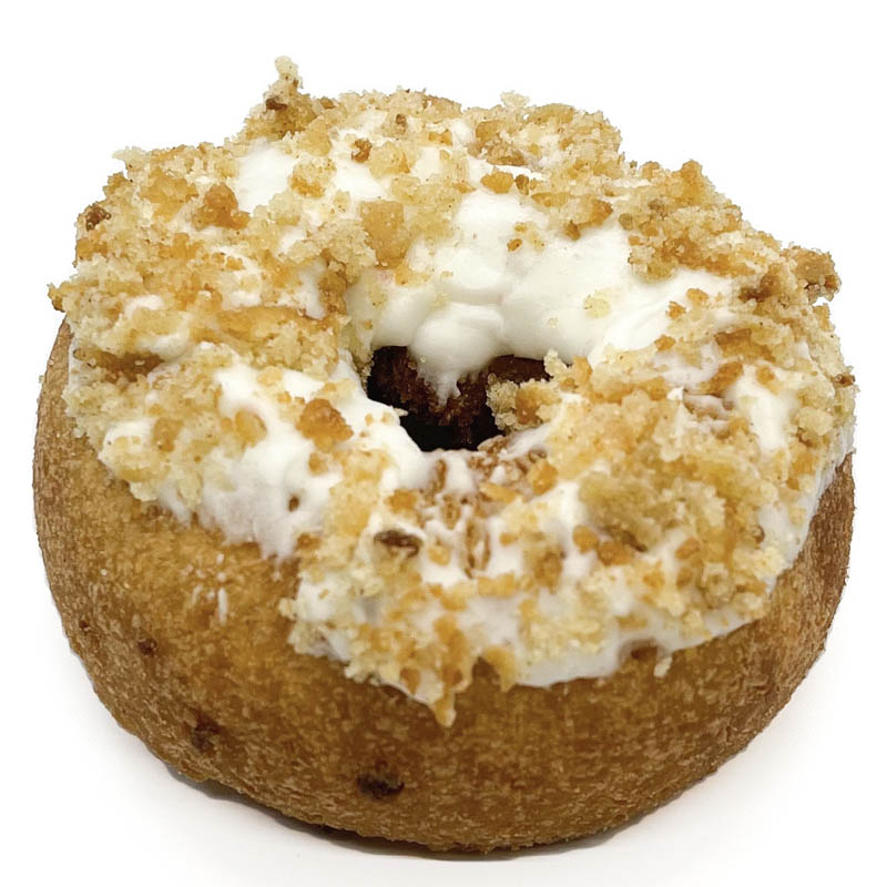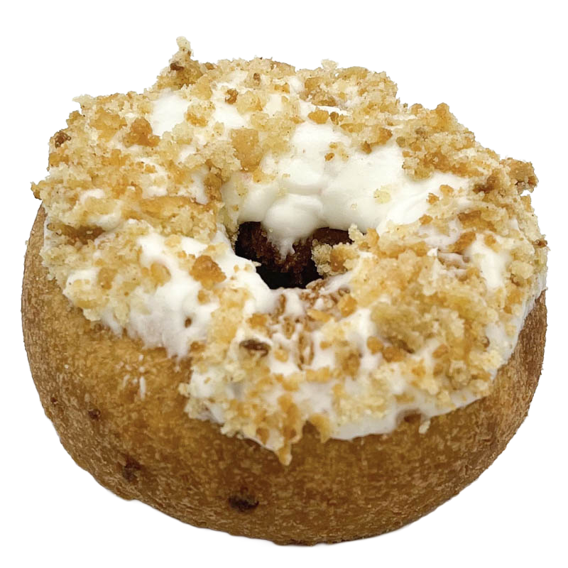 Apple cake donut, cream cheese glaze, apple cake crumb