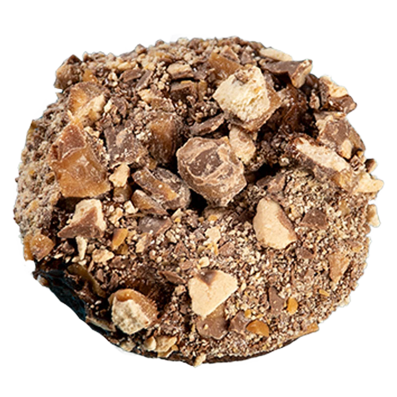 Chocolate cake donut, Chocolate Fudge glaze, chopped Twix