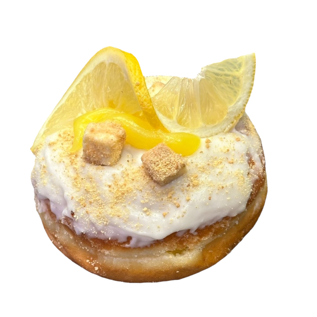 RAISED DONUT FILLED WITH LEMON JELLY, TOPPED WITH A CREAM CHEESE GLAZE AND GRAHAM CRACKER CRUMBS