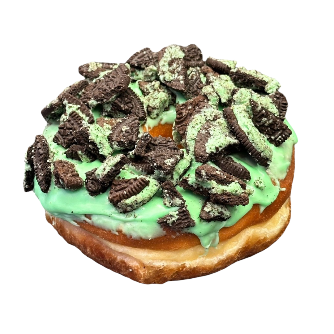 YEAST DONUT TOPPED WITH A VANILLA GLAZE AND LOTS OF MINT OREO COOKIES!