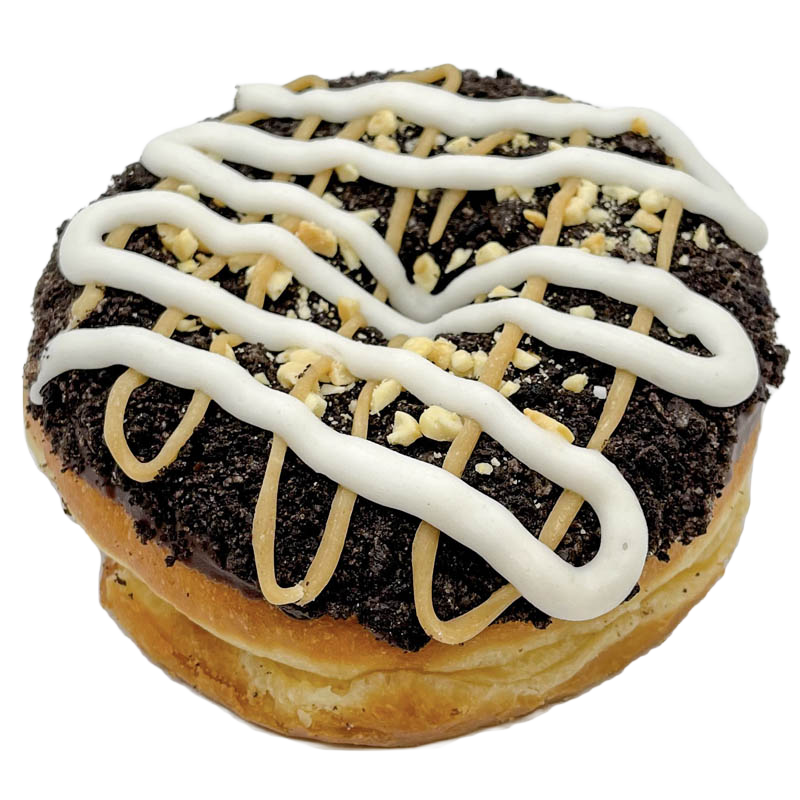 Chocolate fudge glaze, Oreo cookie crumbs, peanut butter and marshmallow drizzle, chopped salted peanuts
