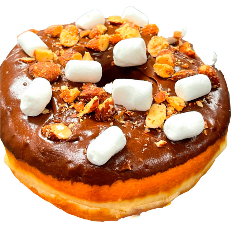 RAISED DONUT WITH RICH CHOCOLATE FUDGE, SALTED ALMONDS AND MARSHMALLOWS